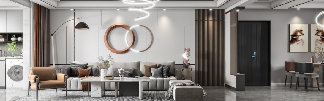 现代客餐厅,背景选用护墙板加木格栅
