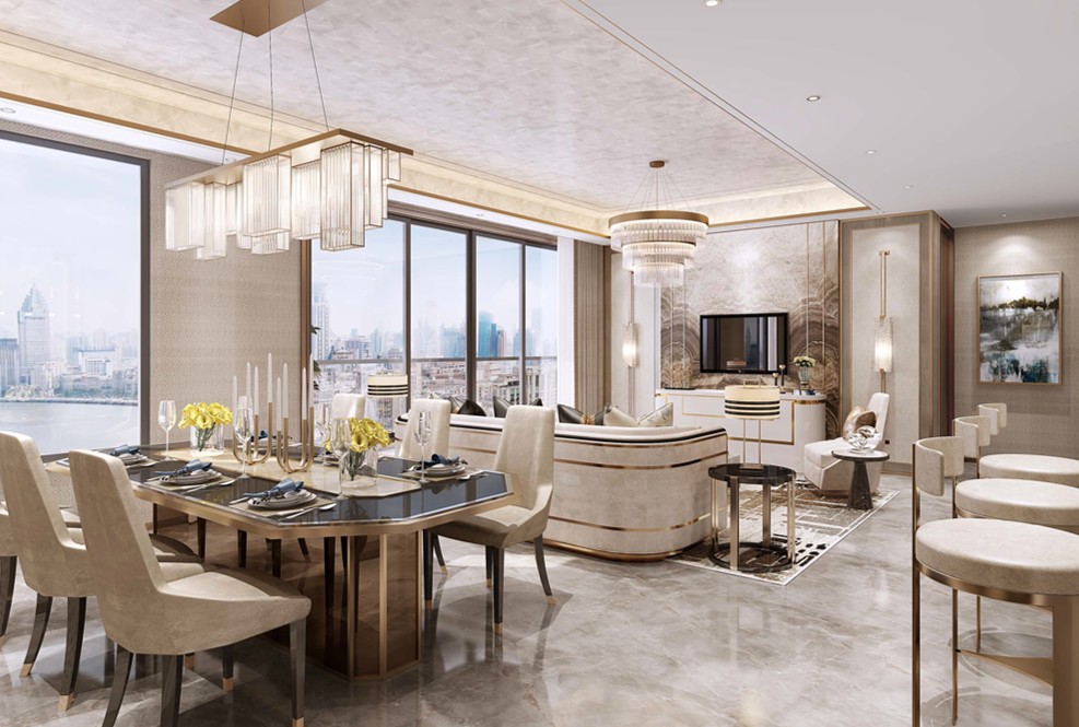 用纯净、淡雅、明快的米黄色调作背景,衬托高品位的家具、灯具及艺术品陈设,结合突出的立体感与节奏感,本准则。