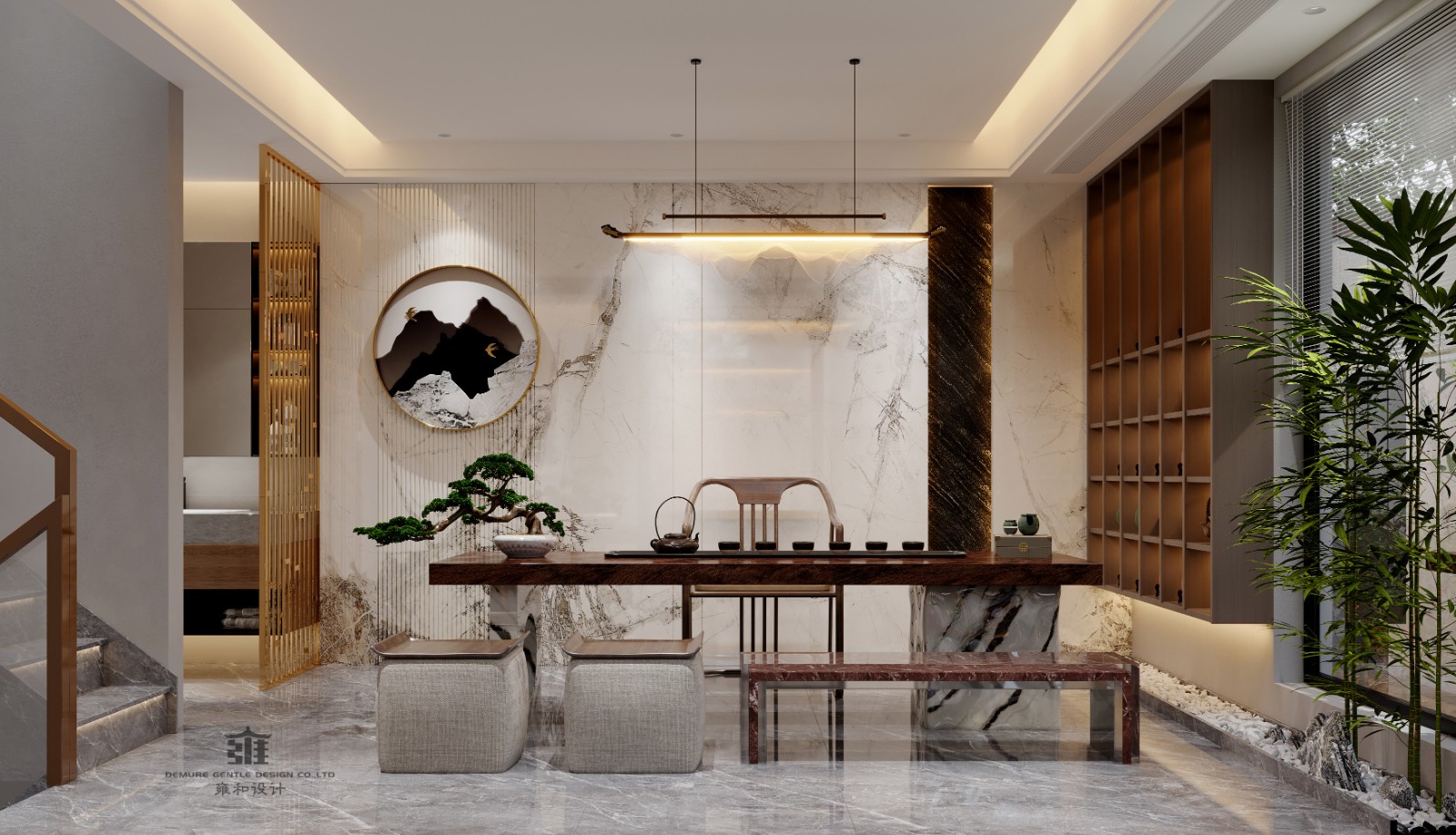 在与业主进行了多次沟通后取消了入厅的客厅,改成茶室,将优雅、雅致、具有独特的品味的精神融入到空间的设计里,简约中带着奢华、奢雅入心,带来自然而富有意境的美感
