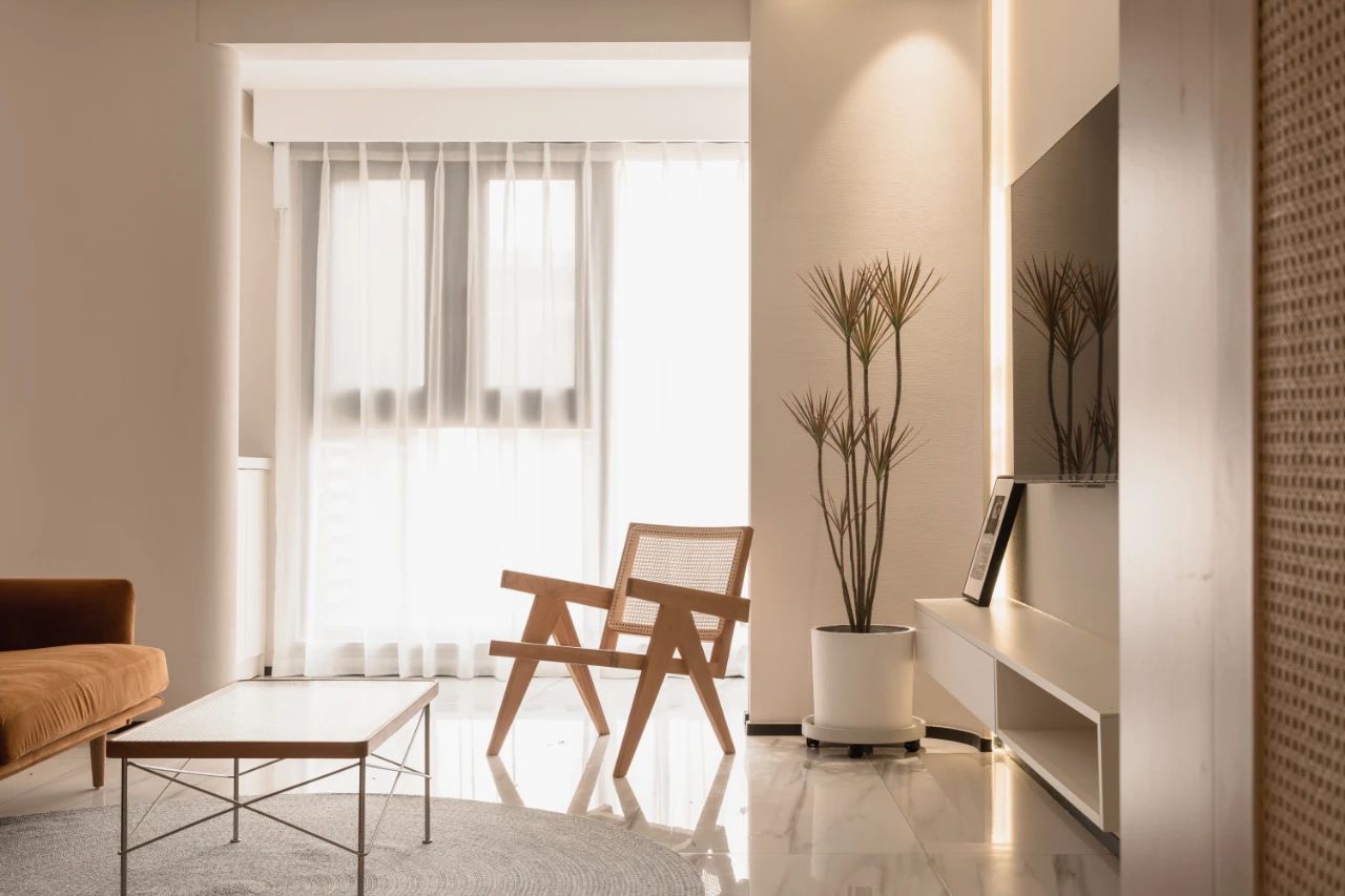 客厅同阳台的承重柱用弧形弱化,增加了光源,地面延伸进双阳台,视觉上尽可能的让房子看起来更大。
