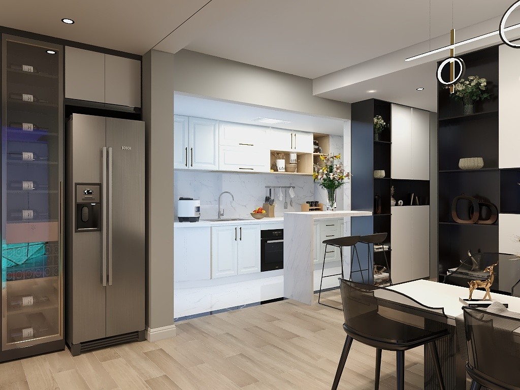 厨房打开白色柜板提亮空间,开放式设计避免空间的拥堵感。