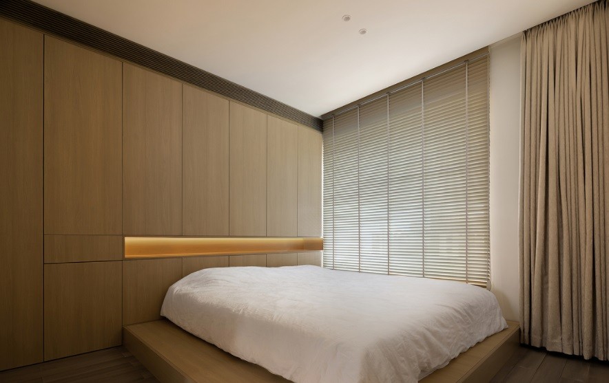 温馨柔和的墙面颜色奠定了极简的基调,原木百叶帘注入温暖与柔和,辅以低色温的光设计,家的氛围纯粹且温馨。