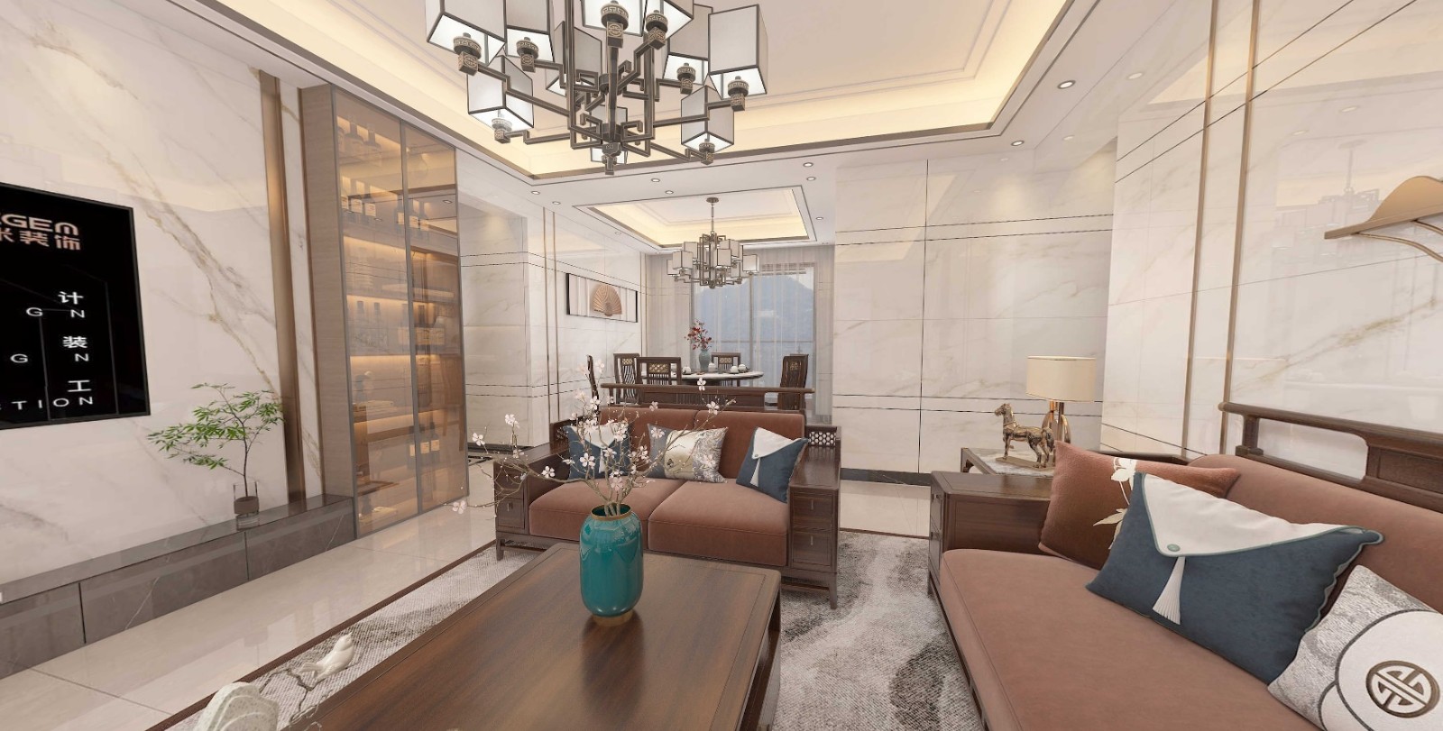 应业主要求,瓷砖上墙,用钢线点缀,简约墙饰,岩板电视背景墙,侧边设置玻璃酒柜,有主灯吊顶。
