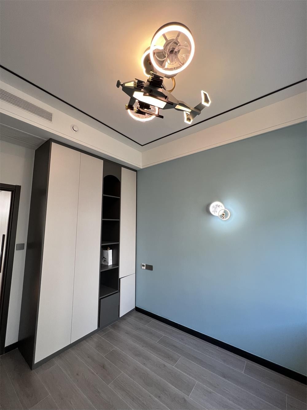 局面吊顶,中间使用黑色的窄条进行了装饰,避免了单调,鲜明的色彩差异也让空间层次感和空间感更强。墙面是蓝色的乳胶漆,持色性久,环保不开裂仿佛置身于海洋或是天空。 地面采用瓷木条铺贴,它质地坚硬密实、不易变形、抗水性好、环保还耐用,有着木地板的纹路却比木地板要还得多。吊灯的造型像是飞机又像是自行车,神奇的造型让它多了一些神秘感,带上灯带,科技感十足。