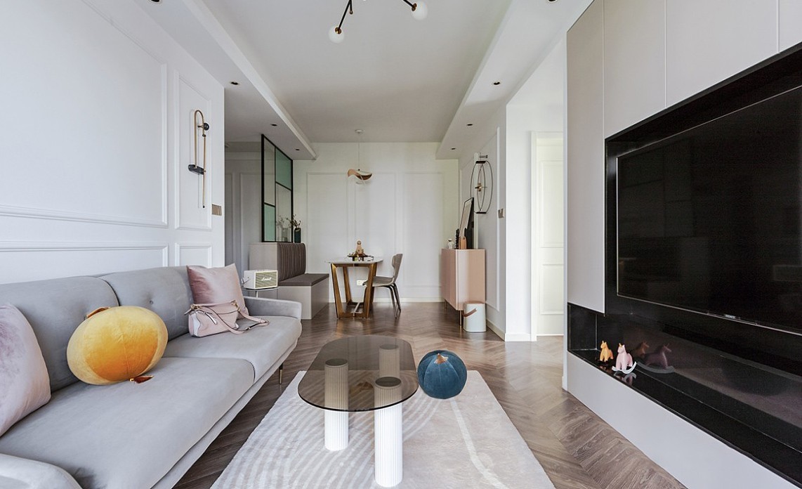 客餐厅以白色为基调,背景墙采用大面积的石膏板线条设计,层次丰富,显得空间更精致、优雅、大气高档。