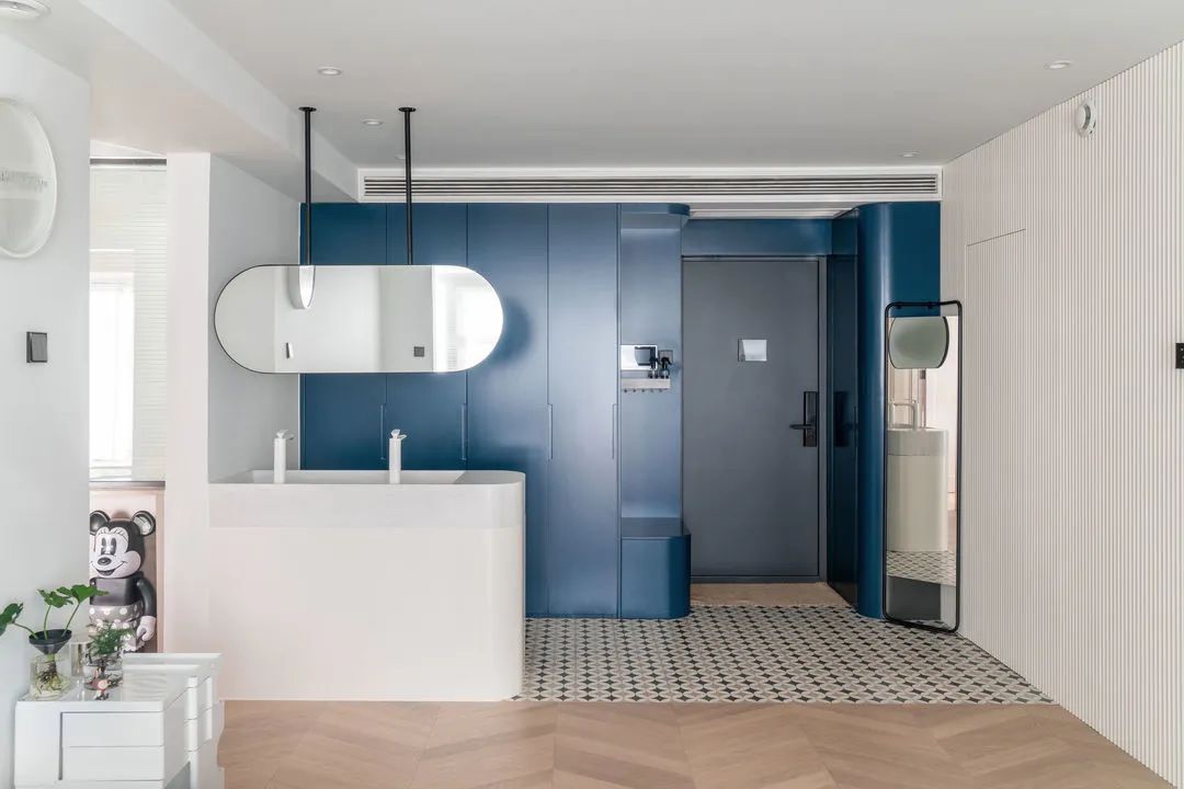 玄关以深蓝色为主,地面铺设花砖不仅起到区域划分的作用,也增添了空间的时尚感。靠墙定制顶天立地衣柜和鞋柜,采用圆角处理,消弭直角尖锐感,让空间柔和舒适。