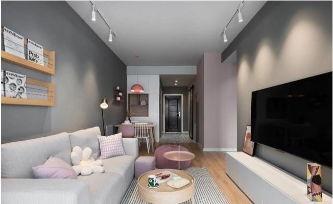 粉灰结合的墙面~为了不让空间看起来太割裂,又用灰色在墙体添加腰线,使之柔和。