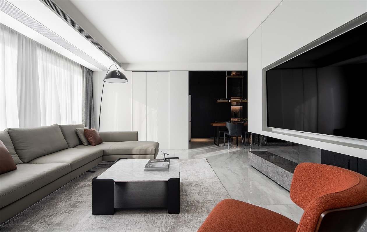 简洁的白色会客厅尽显简约,明确的黑白调子,偶然镶嵌着几处明艳的橘色装饰,空间层次明朗温润。冷静到克制的背后,满含丰富的生活细节。