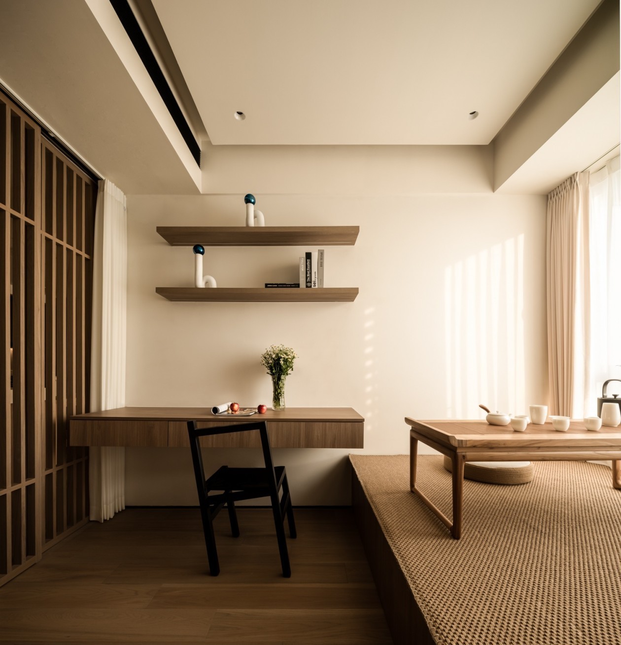 主卧室在原有客厅挑空的基础上现浇而成,结合二层其他空间,我们将整个二层做为夫妻二人的专属私密区,做成一个套房(休闲阳台+卧室+临时书房+衣帽间)。
