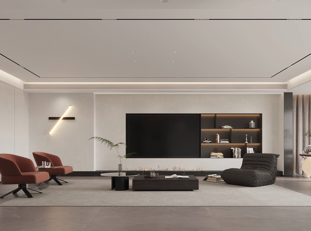 电视墙整体也使用暖灰色调来做背景,旁边做一组大的收纳格再搭配上大尺寸电视,增加整体的层次感。