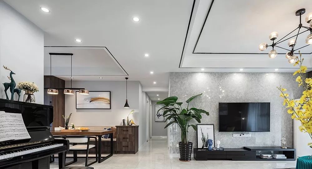 客厅采取黑色不锈钢线条勾划,浅浅带出空间里的精致深度。电视背景墙的饰面材质样式,处理的简洁而富有品味,干净自然。