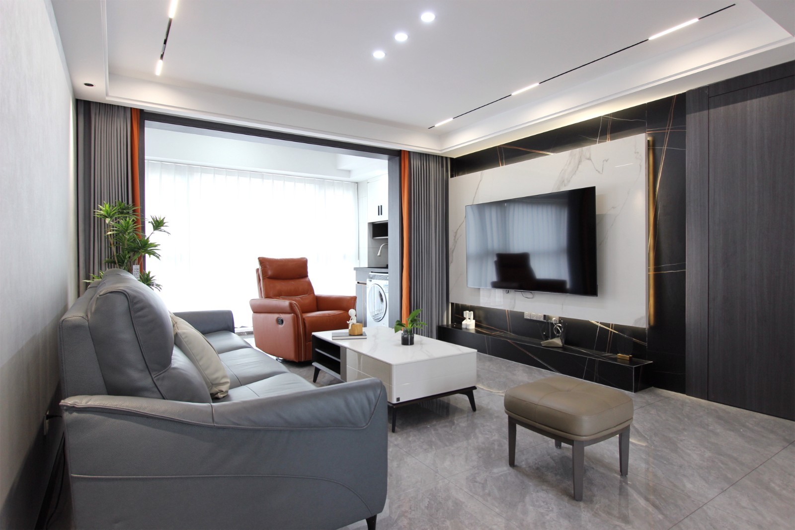 电视背景墙选用黑色大理石,纹理清晰有质感,地台底部抬高用作置物台,整体好看又易清理。另外还有巧妙的隐形门设计,完美的隐藏了客卧空间。