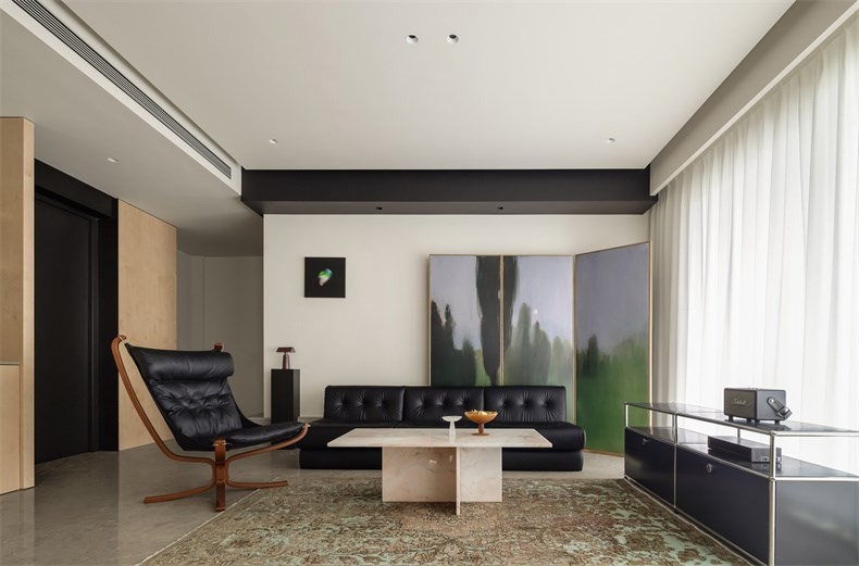 自带肌理感的大理石材代替踢脚线做地台,上方置入银色PET肤感板,新设的黑色体块用来遮挡原始地暖分水器,围绕墙体穿插至沙发区形成一个照明装置,两个体块化零为整,结合为玄关