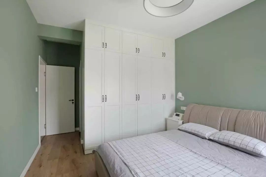 卧室采用了简洁的硬装,草绿色的墙面、白色的家具和浅灰色色的床相互搭配,通过色彩来诠释空间氛围,呈现出一个年轻、活力又小清新的感觉,整个空间显得非常舒适和宜人,让人感到轻松和愉悦。