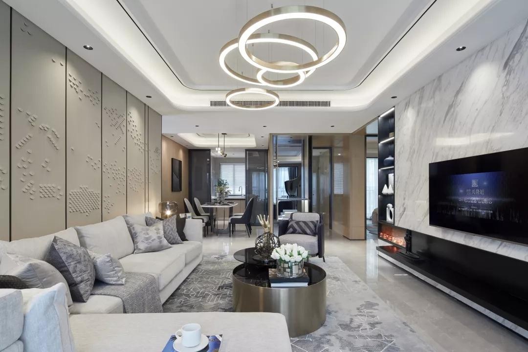 电视墙在白色优雅的大理石基底,加入黑色端庄的电视柜与展示柜,带来一个现代华丽舒适的视觉感