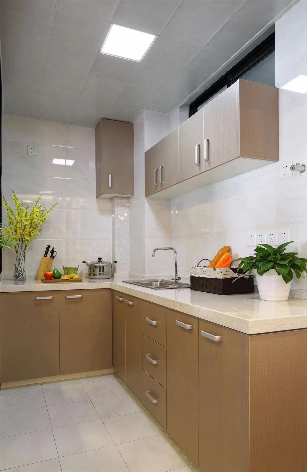 厨房的整体色调比较统一,设计不影响正常的通风、照明等,厨房首重使用,不能只以美观为设计原则