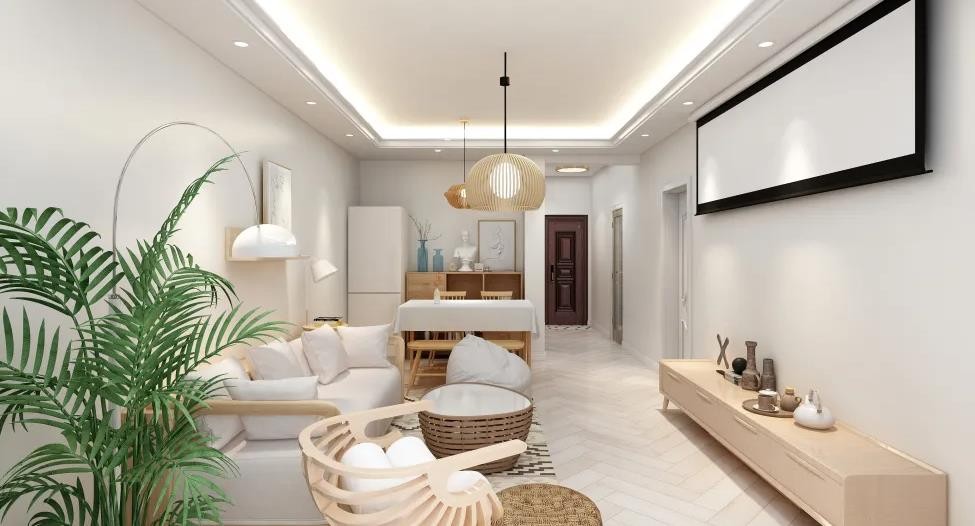 客餐厅色彩搭配选用了白与原木色的清新风格,造型生动而不沉闷。卧室则使用了更贴近生活的色彩搭配方案