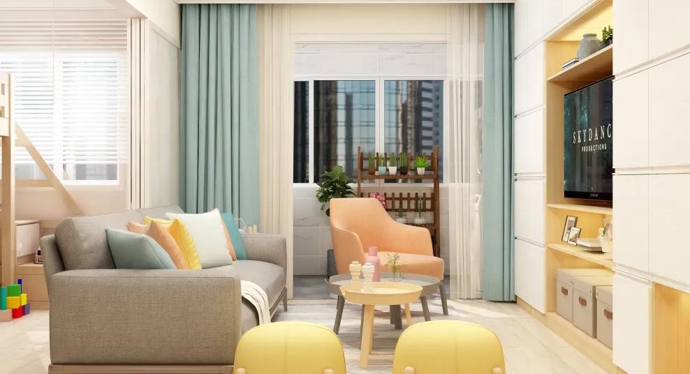 此案为两房两厅的户型,套内约为65平方。在规划上将电视柜做大量的收纳,可以收纳小朋友玩具及家中杂物。儿童房与客厅采用折叠门,平时可以打开空间显得宽敞,拉起时可保证隐私。