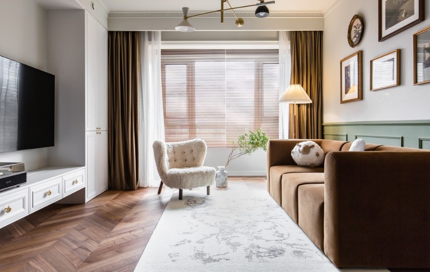 整个空间以白+橄榄绿打造和谐耐看的空间氛围,没有过多浮夸繁复的元素舒适惬意,鱼骨拼地板更加生动深邃,软装同样遵循舒适、耐看的思路选用;