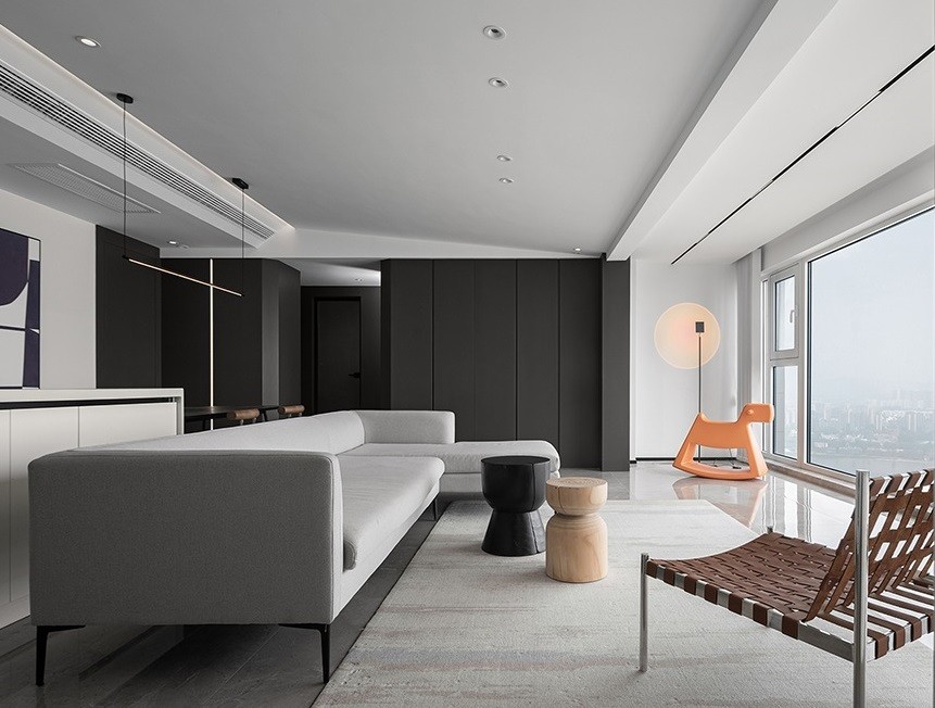 值得一提的是吊顶设计,以斜面吊顶来呼应这个横厅设计,让空间更有层次感和造型感,结合吊顶设计做了无主灯设计,内嵌式灯带与射灯保证了整个空间的光源的同时增加了氛围感。