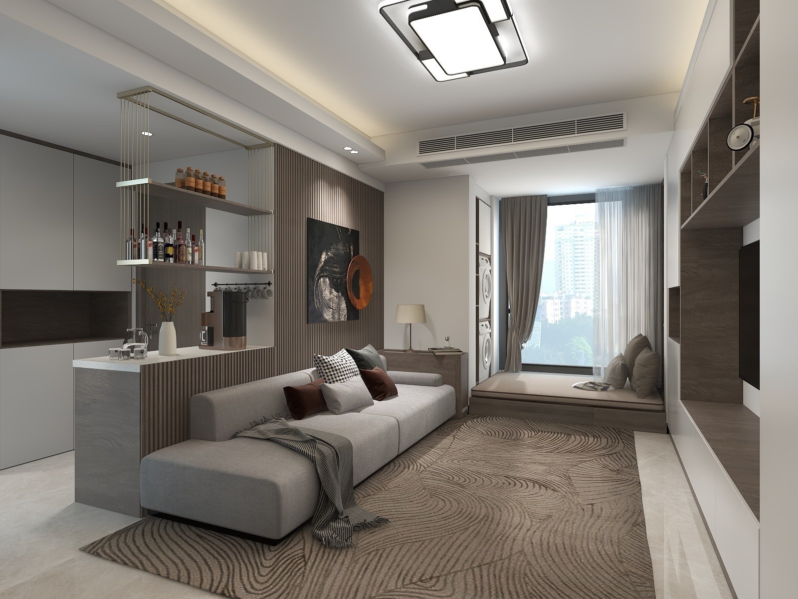 客厅以一字型沙发延伸阳台木地台,背靠水吧,每个空间都有一定的联动性