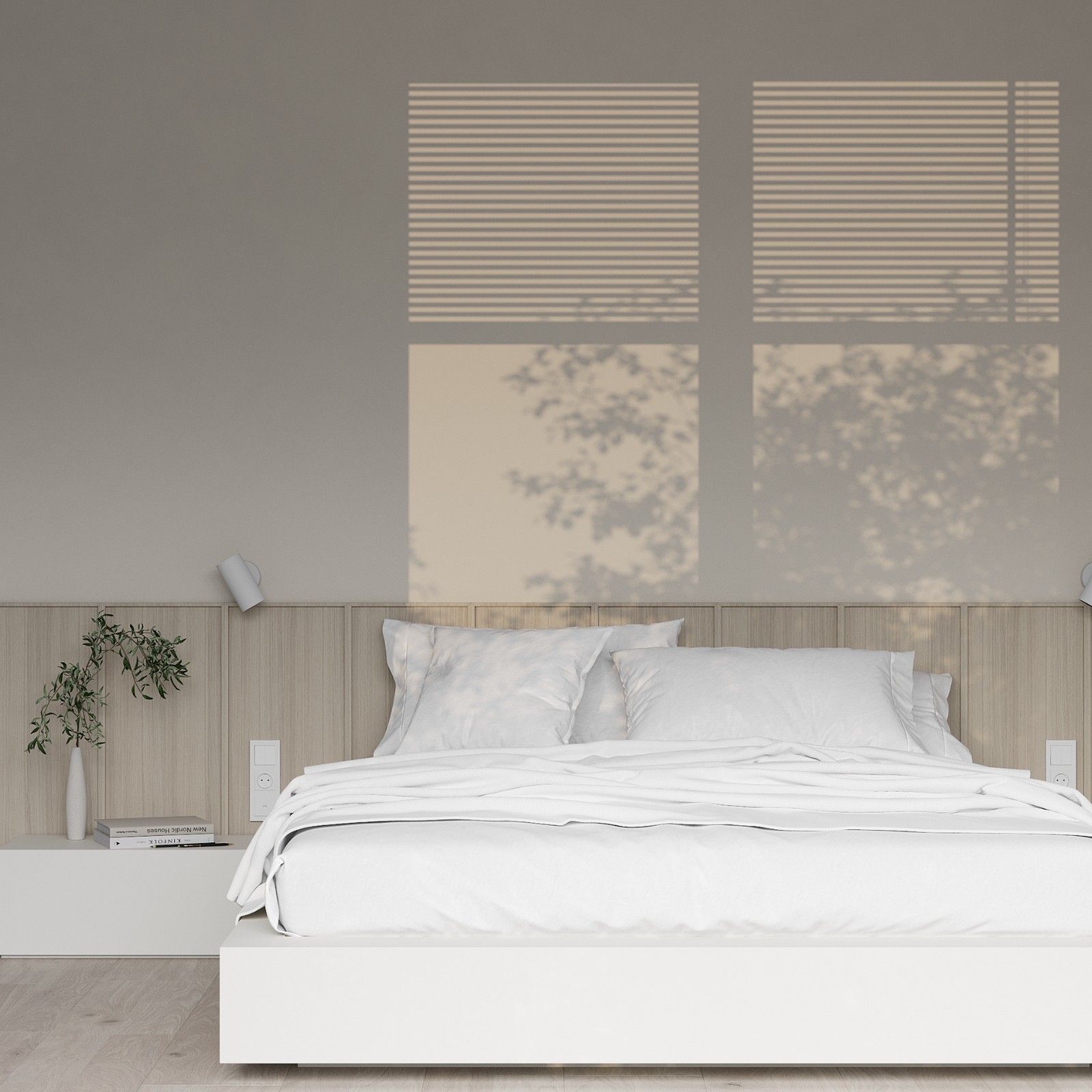 卧室整体墙面是奶白色,床头墙的位置增加与地板相同纹理的墙面设计,纯白的床品旁置放同色系床头柜,简洁大方。