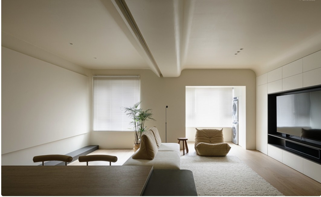客厅无主灯设计,搭配点光、线性光,使光线投射在富有肌理的墙、地面,氛围感浓厚。