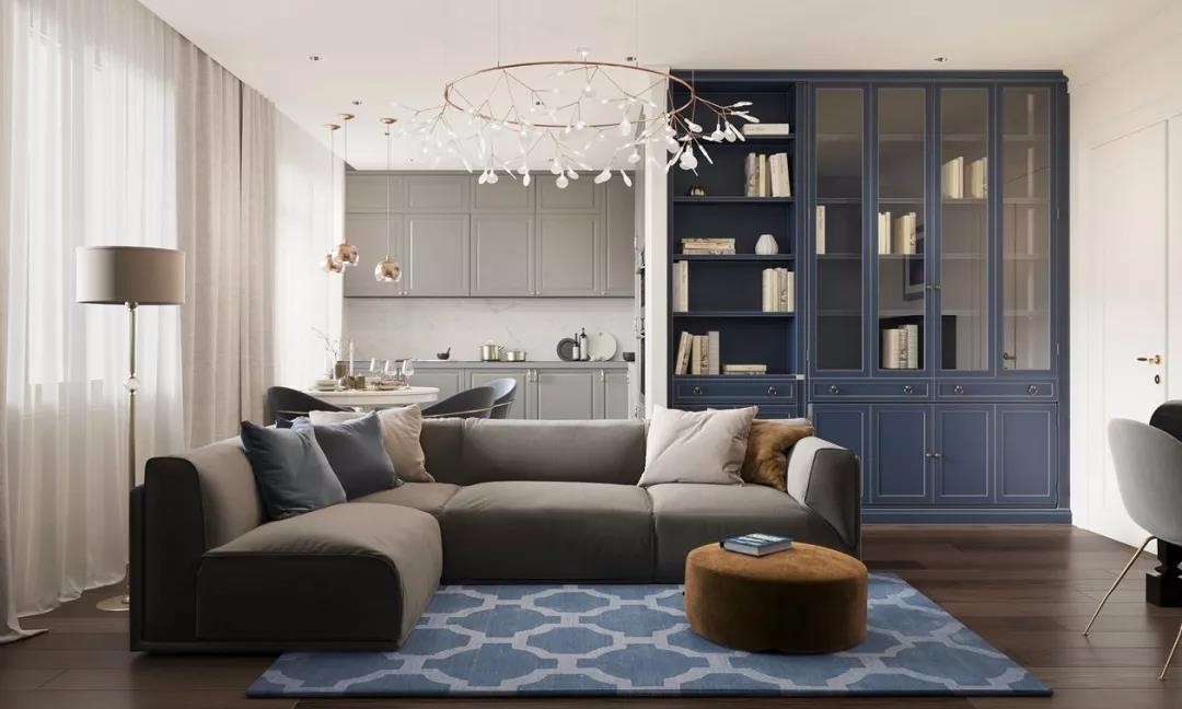 客厅配色上,蓝,灰白色为主要基调,打造一种端庄沉稳的风格。