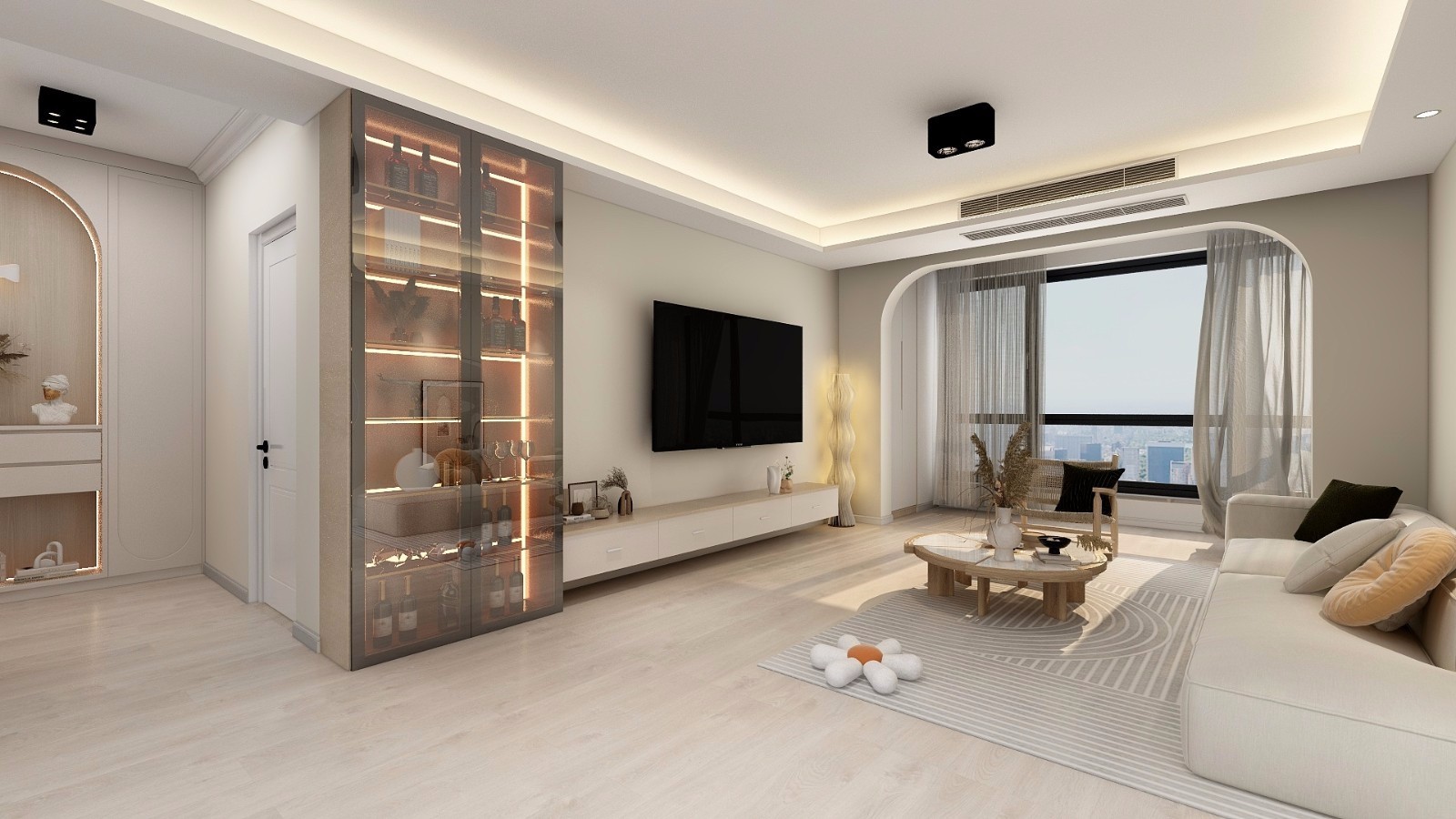 主要以浅色为主,大面积留白,隐藏灯带照明,辅以无主灯加部分射灯,带来温馨与舒适并存的感觉