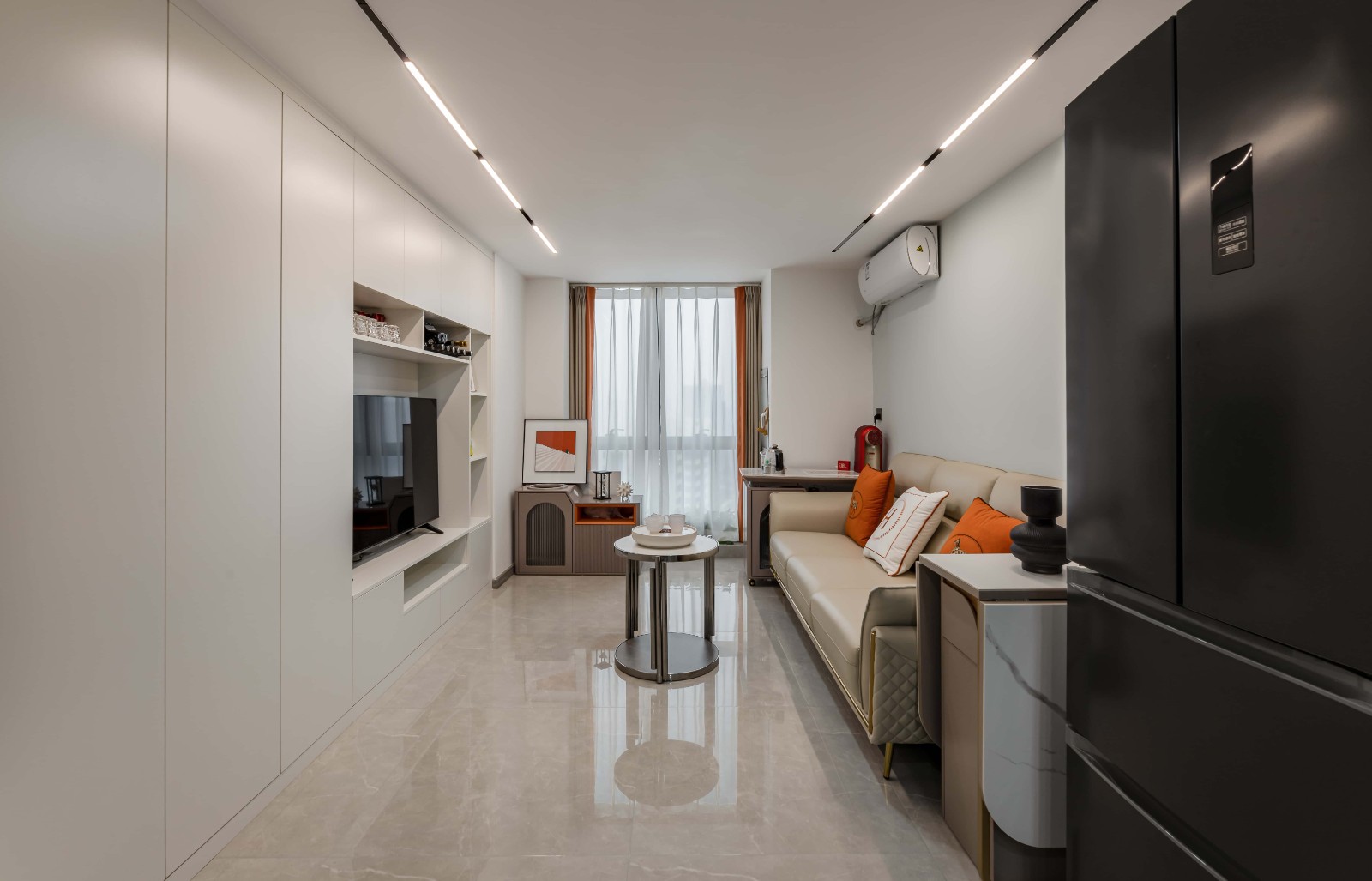 客厅以白色为主调,更显宽敞的空间感。浅灰色云纹亮面地砖,光亮的质感为家增添了华丽气质。 灯光布置上,全屋以无主灯的设计方式布局灯具,让空间更显开阔。客厅顶面嵌入磁吸轨道灯,起到拉伸空间的视觉效果,也将会客区与餐厨区做个区隔。