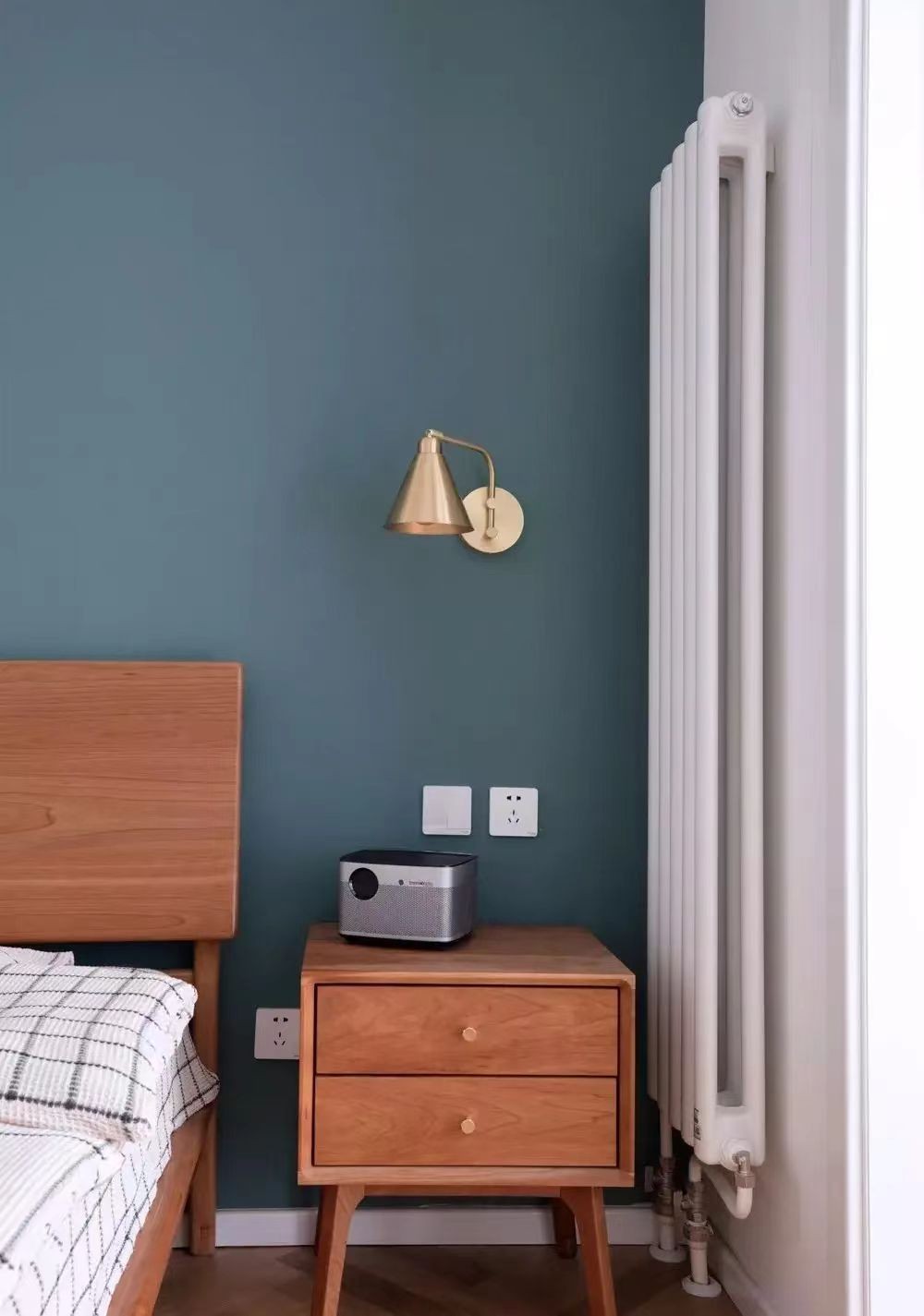 墨绿色的床头背景,搭配原木家具,自然复古。