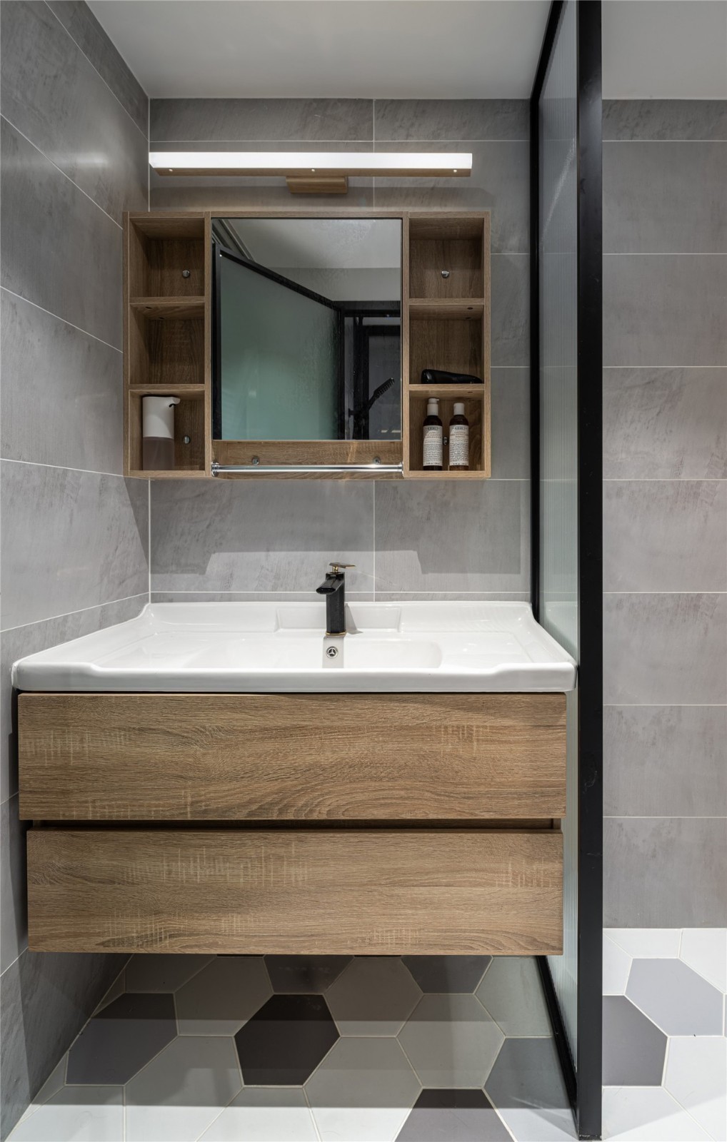 洗手台外置,壁挂形式,底部可以放猫咪的猫砂盆,也可以放脏衣篓,六角砖使木地板地砖自然拼接。