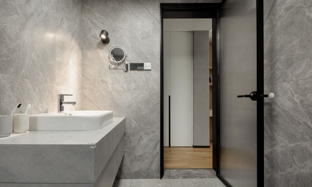 卫生间,黑白灰主调简约而大方,石材自带的花纹也更添一份自然与别致。