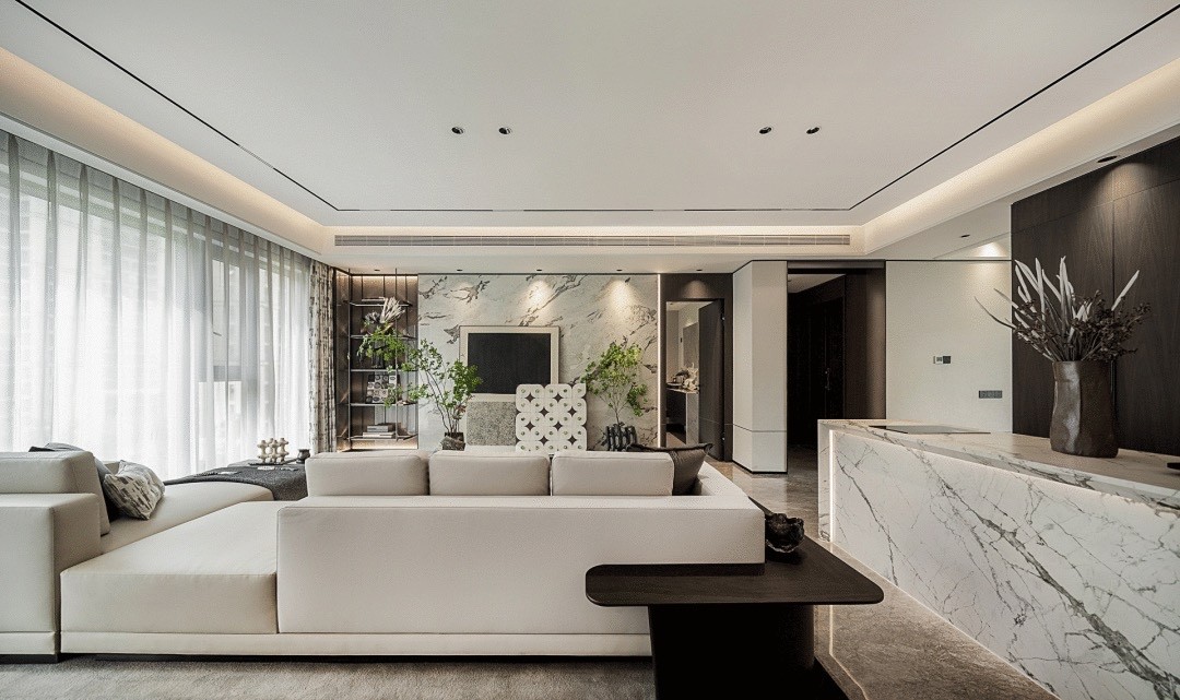 不同纹理填充空间,丰富视觉层次感的同时,展示生活与艺术共创空间,兼具家人的情感交流和娱乐功能,赋予客厅多元、包容的情绪,突出整个空间以人为本、端庄稳重的气质。