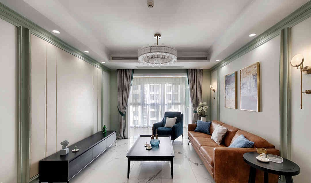 沙发背景墙和电视墙我们都是用的石膏护墙板,采用了美式的经典收框,颜色浅绿浅绿的很是可爱!