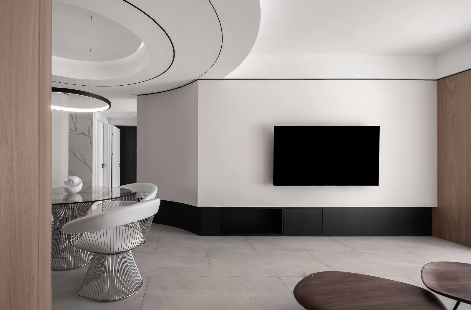 材质的选择和质地,空间四下呼应的细节以及黑白平衡与柔和色调之间的互动,这样简约的空间中也丝毫不缺乏温馨之情,运用材质而后产生的效果为空间内部提供连续性,弧形出现在高低多个维度中,细节间的过渡干净又简洁,是娴熟表达出内容的克制精致感。