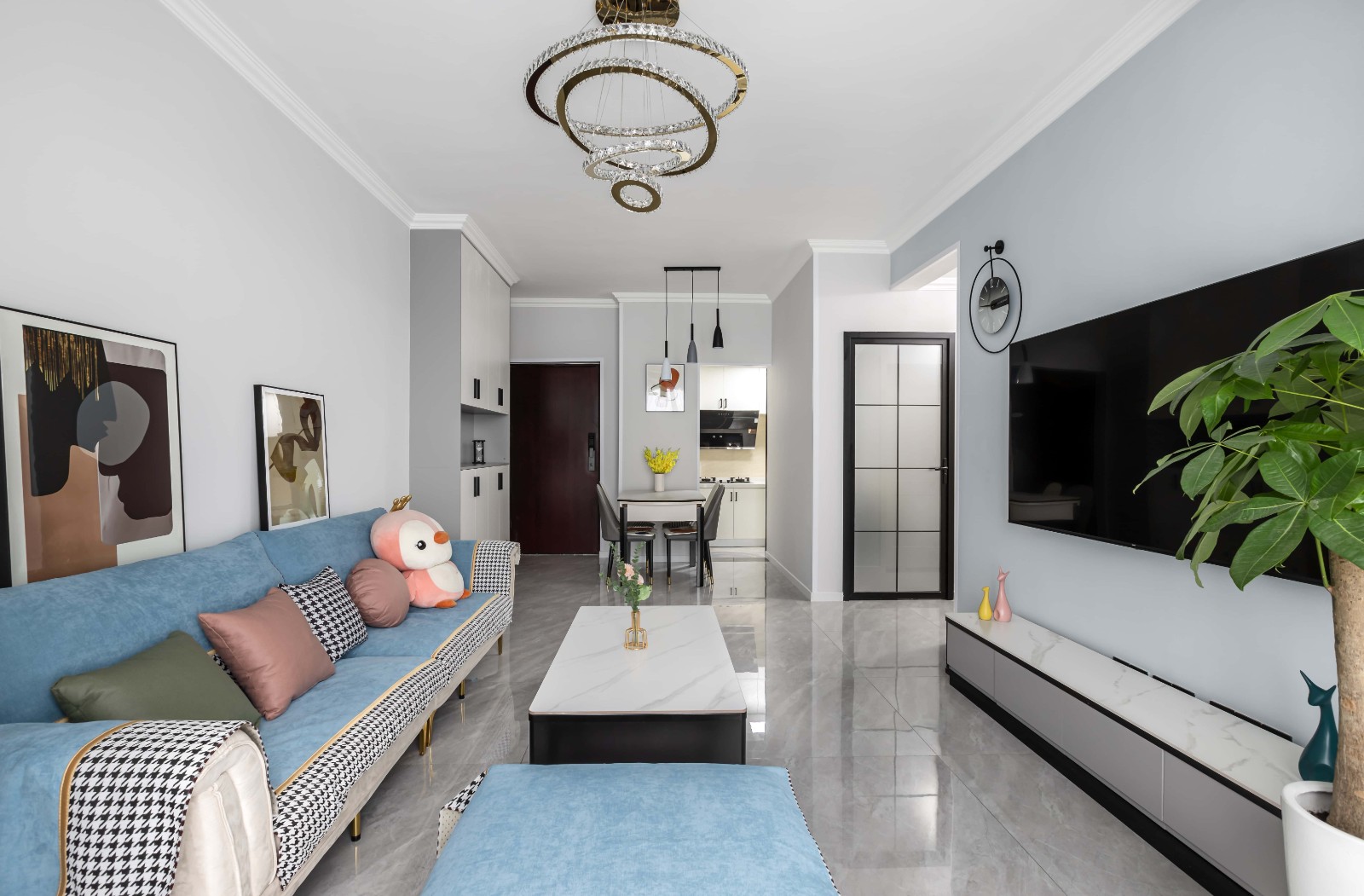进入客厅,回家的心情变得晴朗起来,全靠电视墙的那抹低饱和度的“蓝”。主人把最喜爱的颜色放在了客厅沙发背景墙,希望带动全家人的好心情。 客餐厅一体布局,无吊顶让2.7米的层高优势尽显,顶面与墙面接口之间用石膏线勾勒,精致又大方。地面通铺900*1200cm的大地砖,几乎无缝的灰色地面非常有***感。