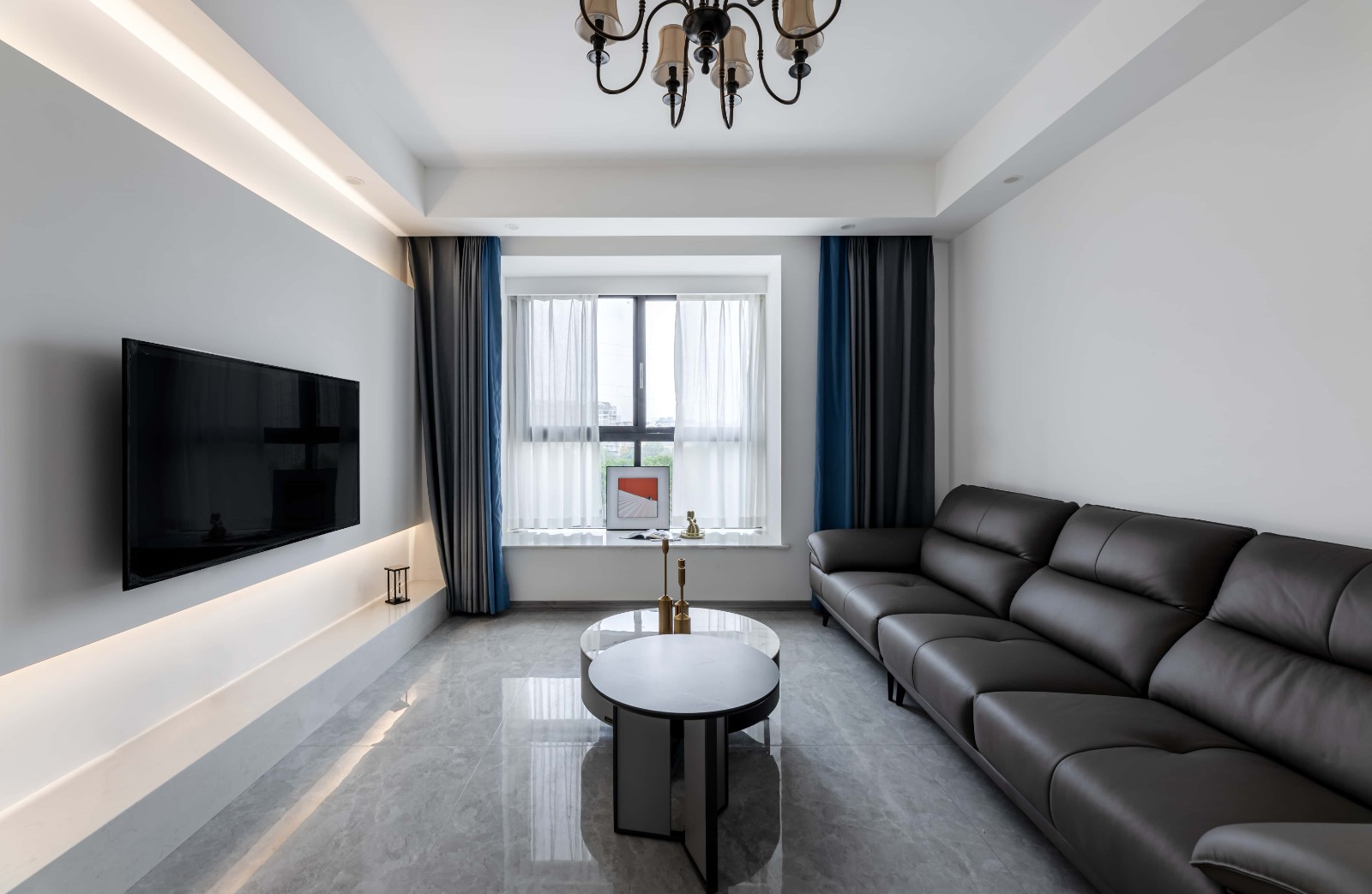 客厅软装方面,以灰色调为主,与整体简洁风格相协调。圆形茶几不占位置,三人座沙发刚好靠墙设立。窗帘盒,隐藏在吊顶横梁里面,窗帘用灰色和深蓝色撞色,为空间增添更多色彩,带来活力氛围。