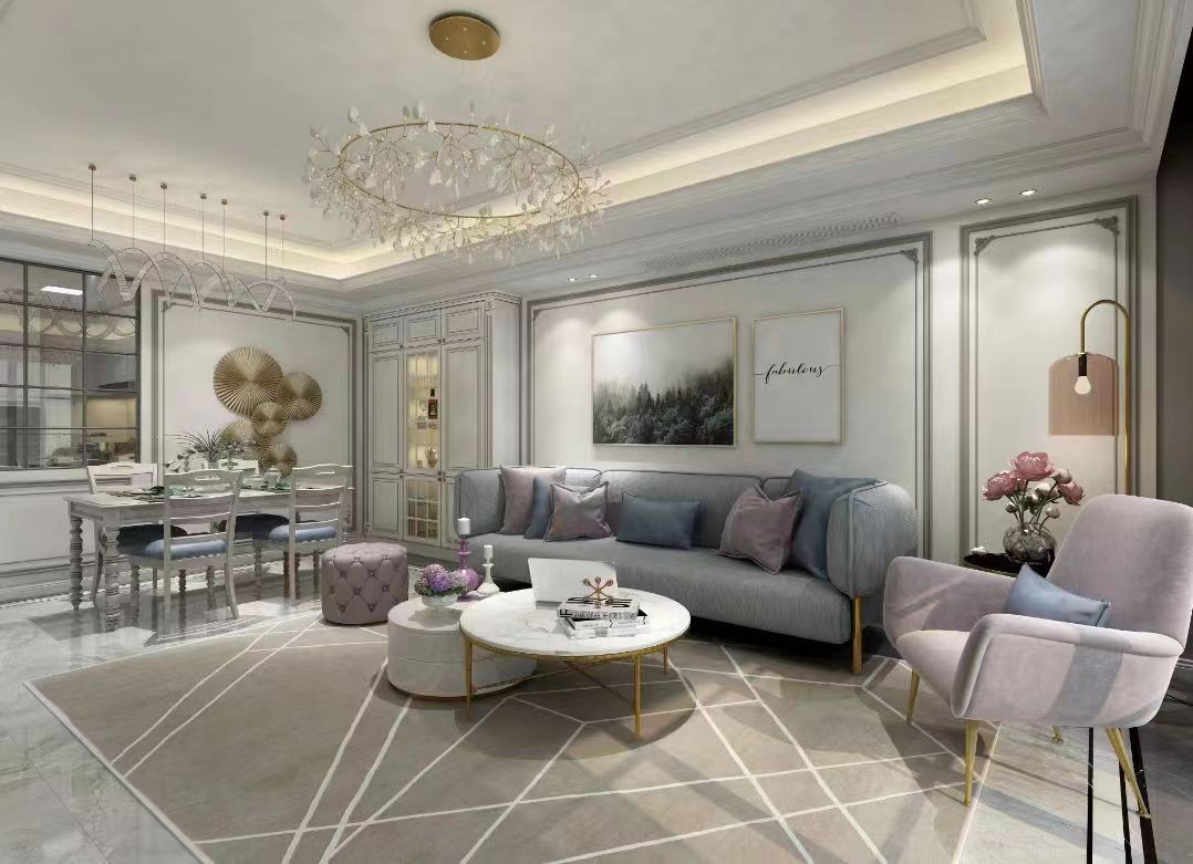 映入眼帘的整体感受非常的简洁,没有花俏华丽的吊灯、复杂的吊顶和壁纸等多余的装饰。有的是亲肤绒面与金属感巧思结合的家具,墙壁上印象画派的装饰挂画,客历桌上白色面具花瓶乃至桌面的小摆设,细节装饰体现了设计师的灵感之举。