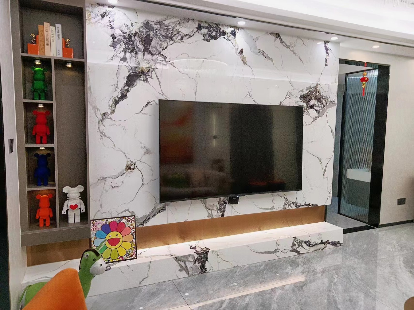 岩板背景墙,边柜摆放艺术产品地台到顶显台子细长大气,不锈钢嵌入包边整齐耐看,折射空间色彩耐看