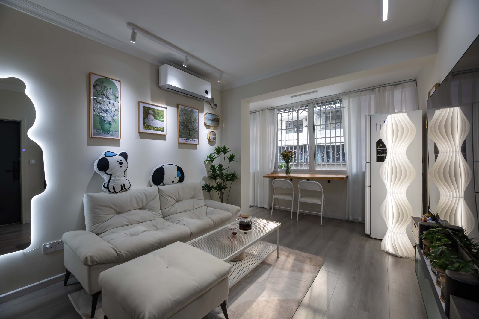 客厅配色以浅淡为主调,让采光不足的老户型,变成亮丽新空间。奶油色墙面温柔又治愈,搭配白色顶面,和白色家具,空间变得更加明亮、清爽。