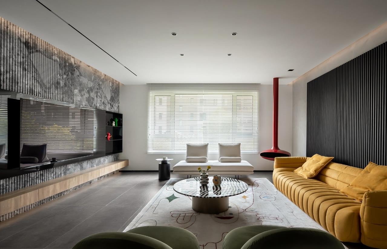以鲜明颜色赋新触觉的多彩体验,轻巧丰盈着客厅的愉悦感,空间戏剧性油然而生。