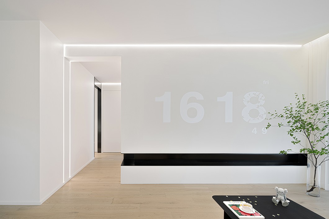 纯白的过道,用黑色不锈钢来点缀,再加上线条灯的效果,让过道有一种很强烈的延伸感。