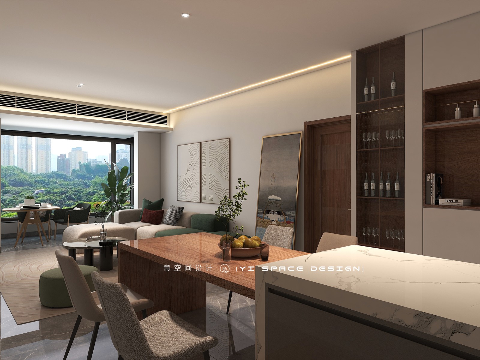 客厅是简约而不张扬的基调,着眼于室内的通透感和流畅感。干净利落的平顶天花,以纯净的白色调为基底,搭配沙发背景墙的灰色,辅助以棕色格栅背景墙的跳色,藉由色彩引申出自然朴质意趣。