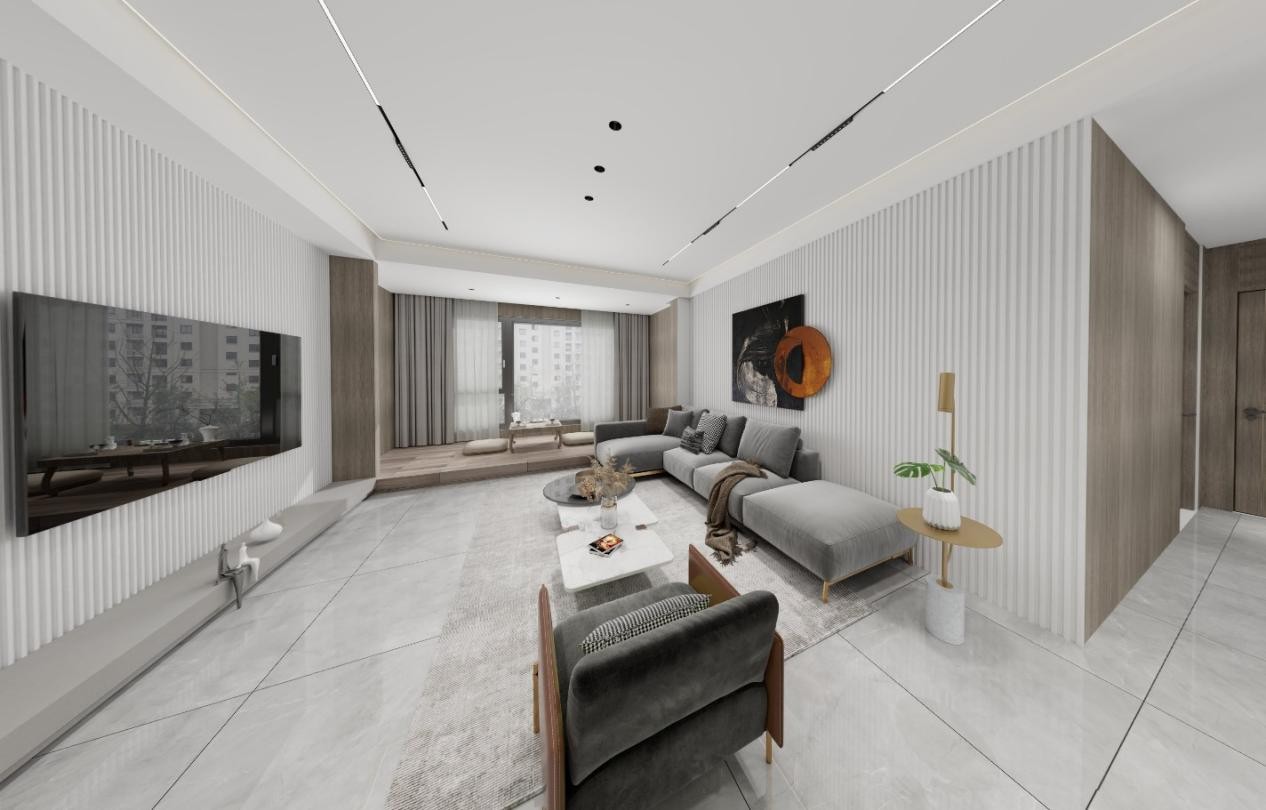客厅 选用白色 灰色奠定整体的色彩基调 呈现现代轻奢的调性,阳台落地窗为空间带来了明亮的光线