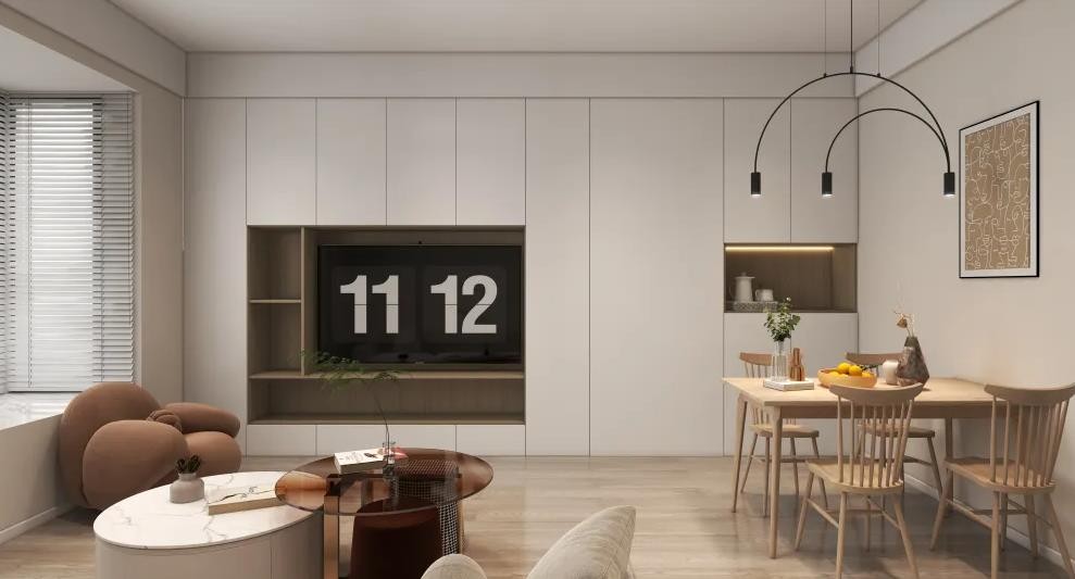 电视背景墙做成柜子,电视镶嵌在柜子里,增加储物