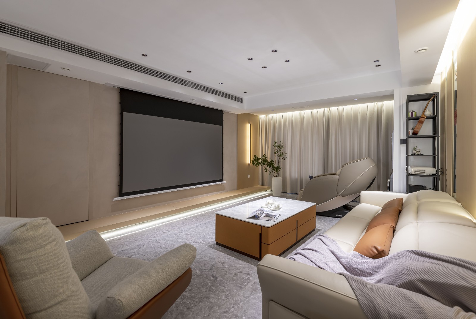 米色一字型沙发立在当头,单人躺椅、自动按摩椅还有方形茶几有序排列,呈现规整的围合式布局。家具色调以米色为主,局部用橘色做了点缀。靠墙还放置了一个高的黑色置物架,里面则有一些精美物件,其中包括业主心爱的小吉他。