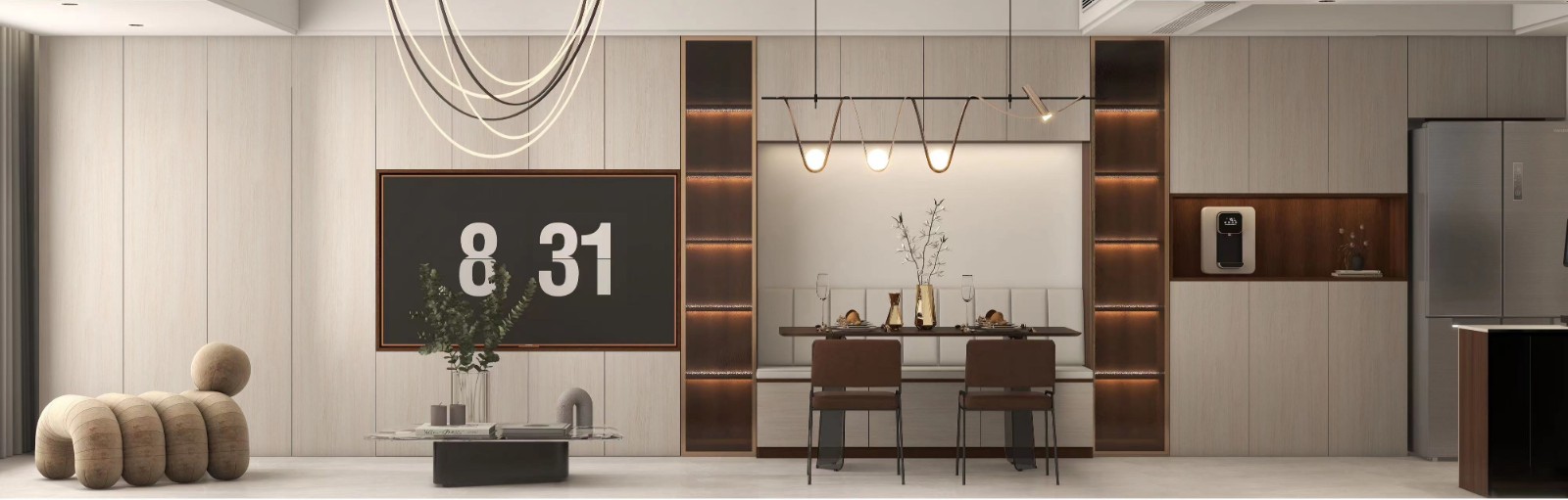 沙发背景挂钟,餐桌上方装饰吊灯。