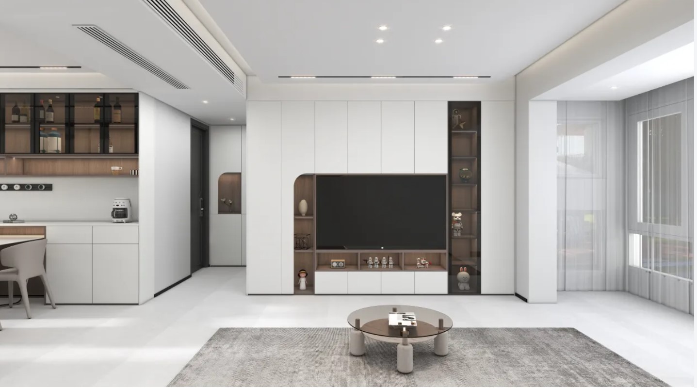 浅灰亚光的地砖搭配无主灯设计顶面,空调出风口一体话设计,咖色的与空间相互呼应。