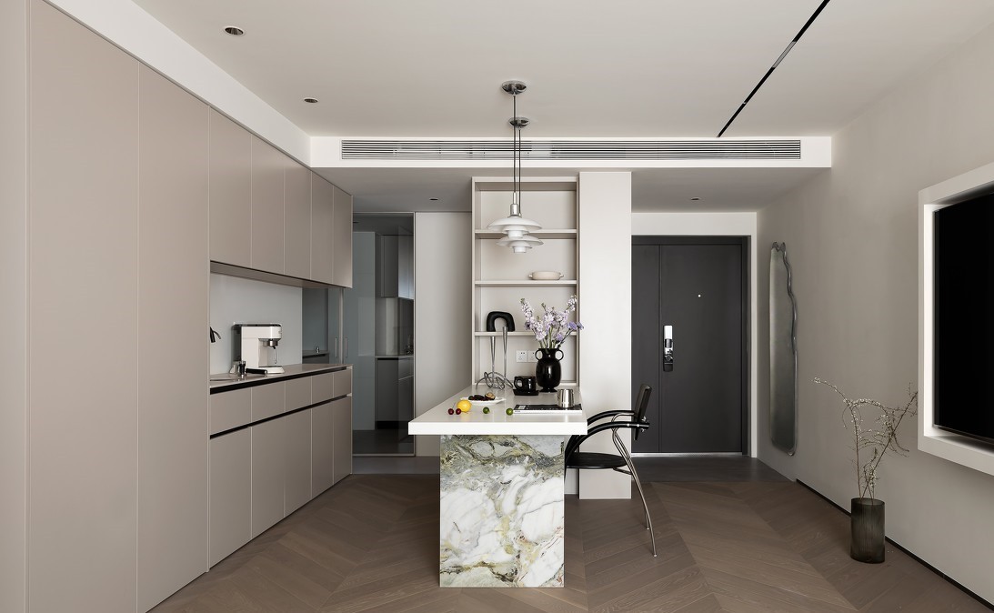 餐厅是入户必经的***个功能区域,非常重要的视觉中心,主要是由定制的餐桌和整面餐边柜组成。餐桌的形式更接近岛台,台面选用哑光质地的奶白色岩板,桌腿为特别定制的天然冷翡翠大理材质,自然石纹散发出的独特质感无可替代。中央空调采用侧出侧回的安装方式,定制和墙顶面同色系极窄加长风口,视觉效果更为简约美观。